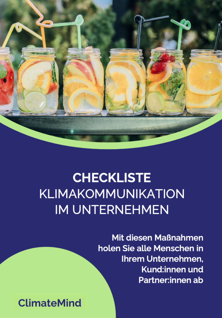 Sie möchten zielgruppenorientierte Klimakommunikation nun auch in Ihrem Unternehmen anwenden? Dann empfehlen wir Ihnenen unsere Checkliste “Klimakommunikation in Unternehmen”. Diese enthält die effektivsten Maßnahmen zur Kommunikation von Klimafragen im Unternehmenskontext und ist explizit so aufgebaut, dass sie direkt in der Praxis angewendet werden kann. Hier gelangen Sie zum Download der Checkliste: